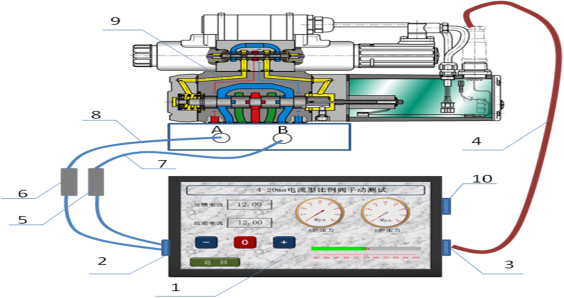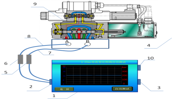 1、在線判斷液壓控制閥設(shè)備故障;在現(xiàn)代化的生產(chǎn)線包含有液壓控制閥的設(shè)備一旦出現(xiàn)故障,普通員工很難判斷是機(jī)械故障、液壓故障還是電氣控制故障;該儀器可解決上述問(wèn)題,一步,斷開與液壓控制閥相連的電氣插頭,把本儀器配套的插頭插上,二步,將壓力傳感器的兩根測(cè)壓線連接到液壓控制閥的A、B口測(cè)壓點(diǎn)上,三步,打開本儀器電源,選擇與液壓控制閥相對(duì)應(yīng)的信號(hào),手動(dòng)測(cè)試即可判斷是機(jī)械故障、液壓故障還是電氣控制故障;如下圖: