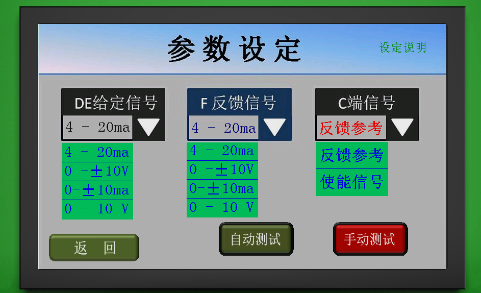 目前市場(chǎng)上常用品牌的液壓控制閥有REXROTH、MOOG、PARK等品牌,早期的液壓控制閥不管是普通換向閥還是比例閥,電氣控制多數(shù)采用外置專用放大板通過(guò)赫斯曼接頭連接;后期的比例和伺服閥多數(shù)采用內(nèi)置放大板,電氣控制多數(shù)4-20ma、0-±10v、0-±10ma和0-10v通過(guò)7芯的航空插頭來(lái)控制,這樣PLC可以直接控制液壓比例、伺服閥,省去了中間放大板,減少了故障點(diǎn);本儀器既可以輸出外置專用放大板的0-2A脈寬調(diào)制電流,又可輸出4-20ma、0-±10v、0-±10ma和0-10v的信號(hào),同時(shí)又能采集液壓比例、伺服閥的閥芯位移信號(hào)以及同步采集液壓控制閥輸出油口壓力;本儀器采用7寸觸摸屏,全中文顯示,使用者需按照內(nèi)置說(shuō)明書操作,即可對(duì)待檢測(cè)的液壓控制閥進(jìn)行性能測(cè)試。