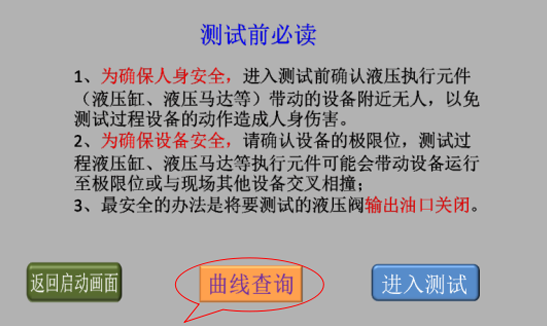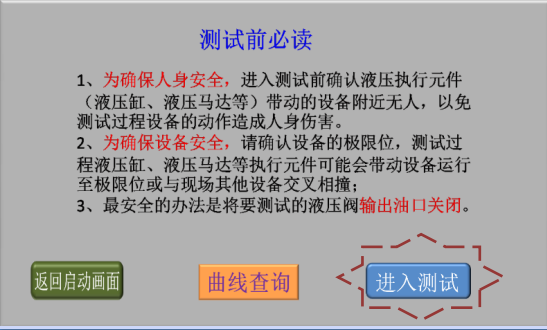 3、確認(rèn)現(xiàn)場(chǎng)人員和設(shè)備安全后,點(diǎn)擊“進(jìn)入測(cè)試”,進(jìn)入液壓閥測(cè)試類型選擇畫面;