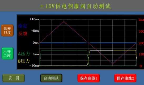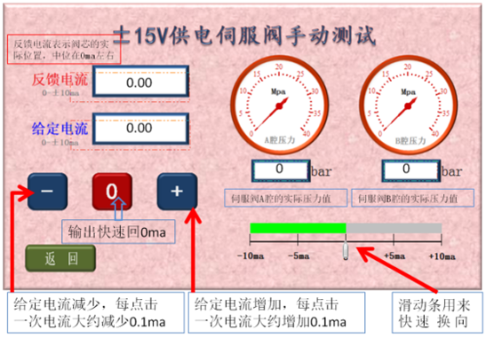 6、伺服閥正常時(shí)的表現(xiàn)為:a、給定電流0ma時(shí),反饋電流在0ma,伺服閥輸出的A、B腔壓力相同;b、用滑動(dòng)條可迅速換向,反饋電流改變且A、B腔壓力差較大;c、點(diǎn)擊增加按鈕,反饋電流逐漸增加且A、B腔壓力差逐漸增大;d、點(diǎn)擊減少按鈕,反饋電流逐漸減少且A、B腔壓力差逐漸減少,過0ma后伺服閥會(huì)換向;
